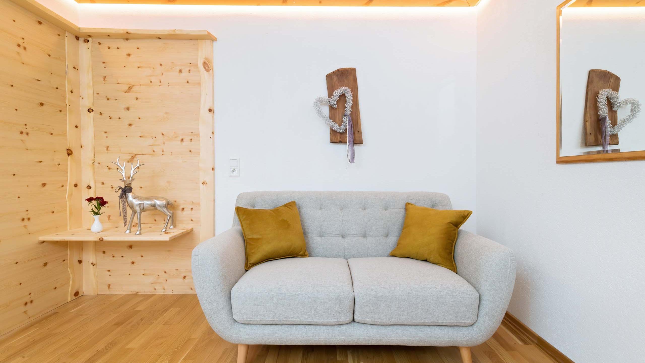 Sleep well with the sweet, woody scent of stone pine whirling about. The “Queen of the Alps” has her own suite here with us. All the furniture is made of genuine stone pine. There is a spacious bedroom and separate living room, plus a whirlpool and infrared cabin.