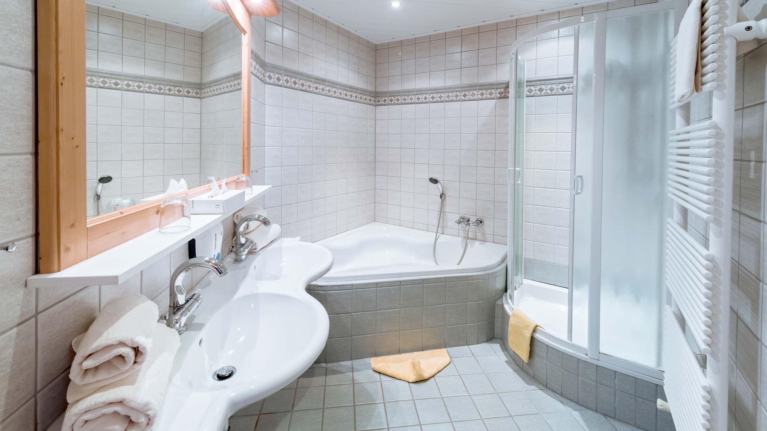 - Großes Badezimmer mit Badewanne, Dusche, Doppelwaschbecken und separatem WC